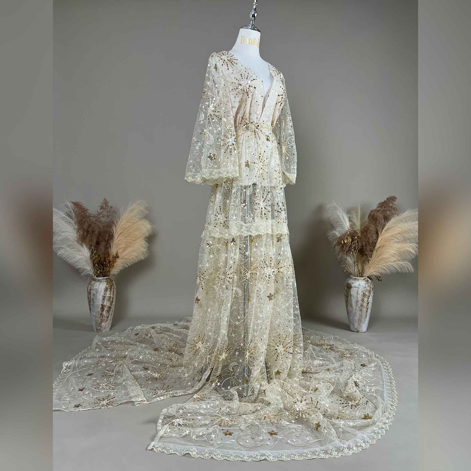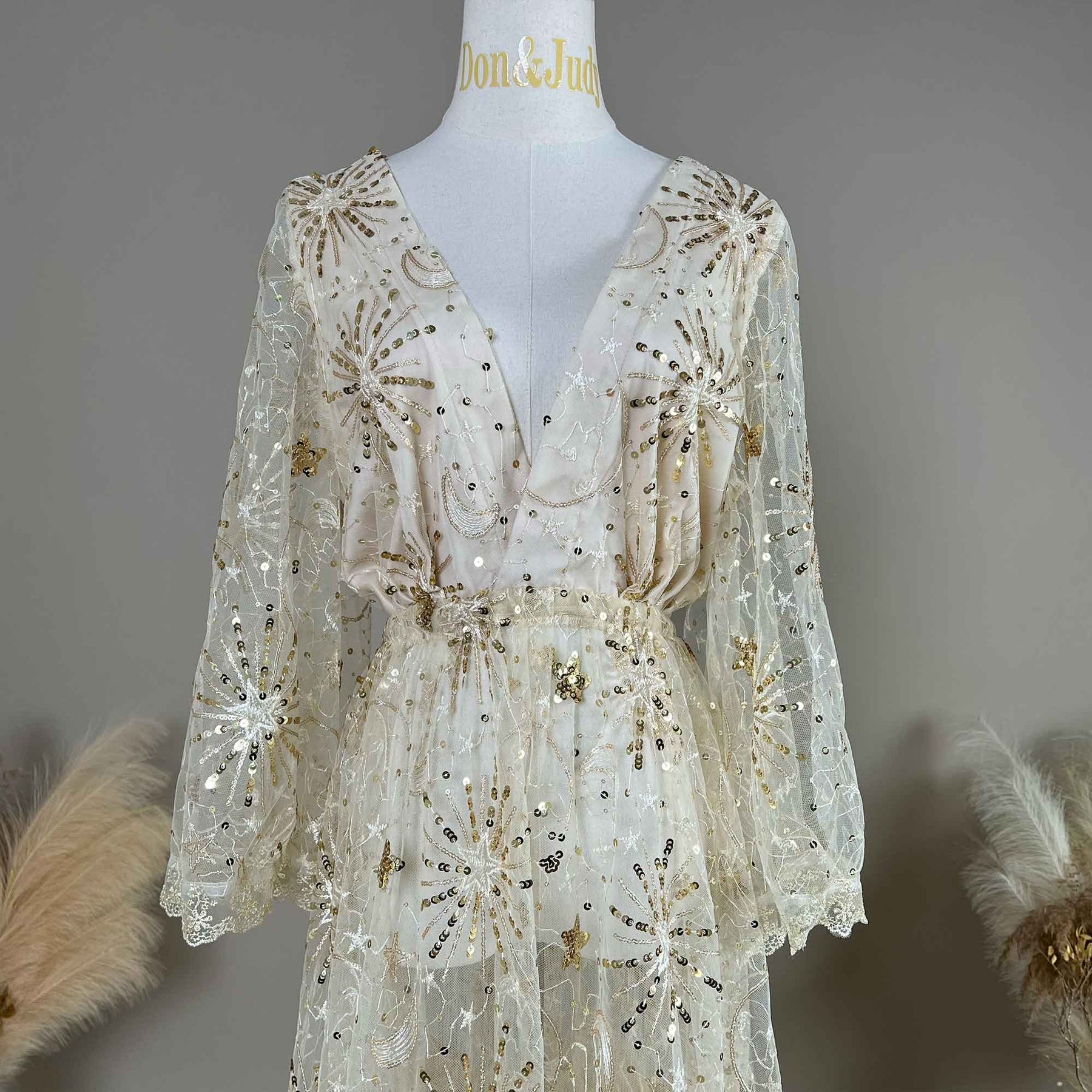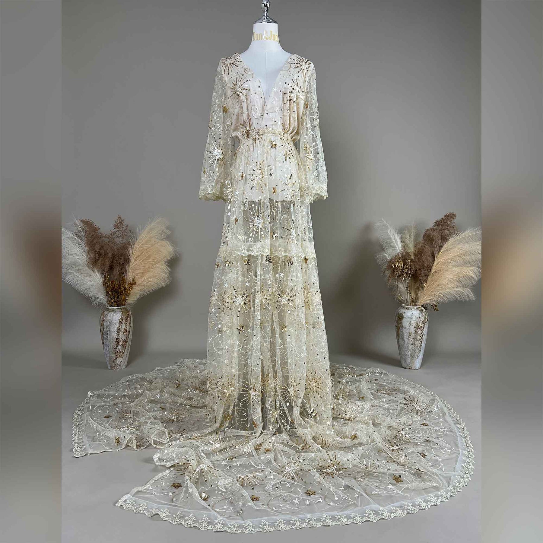 Product name: Gold Free Size Boho V-neck Long Sleeves Sequence Dress Maternity Gown Photography Dress Party Dresses Baby Shower Photo Props Kaftan Robe Maternity Couture Pregnancy Clothes for Woman Photo Shoot with Embroidery Moon and Star