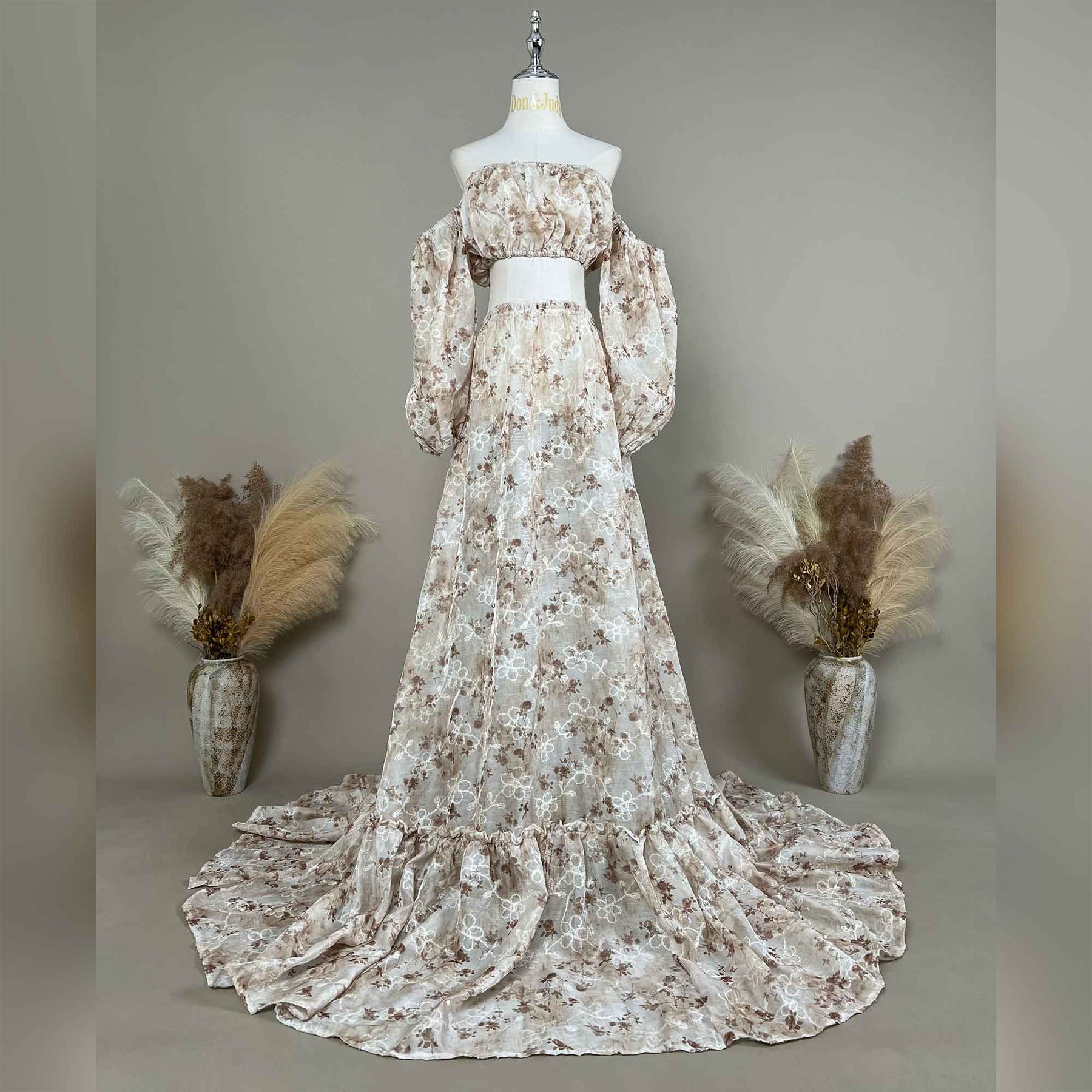 Product name: Camel Metallic Thread Floral Embroidered Strapless Two-Piece Set Dress Maternity or Non-maternity  Gown Pregnant Dress Photoshoot Baby Shower Gift