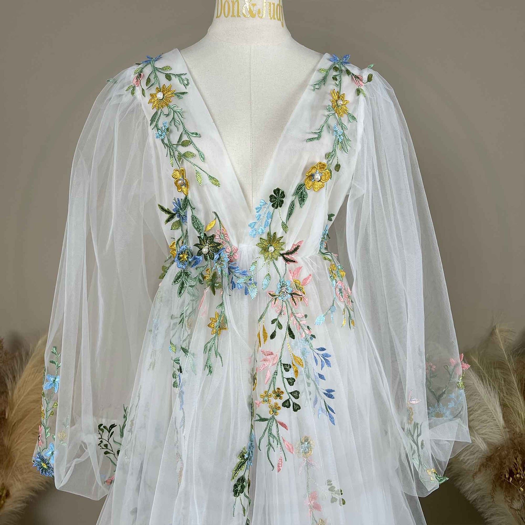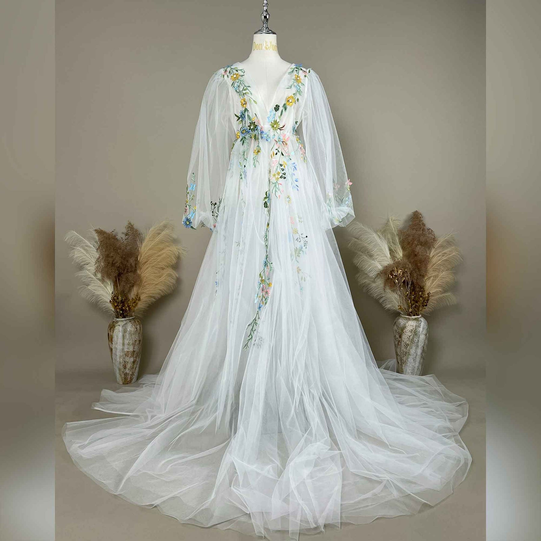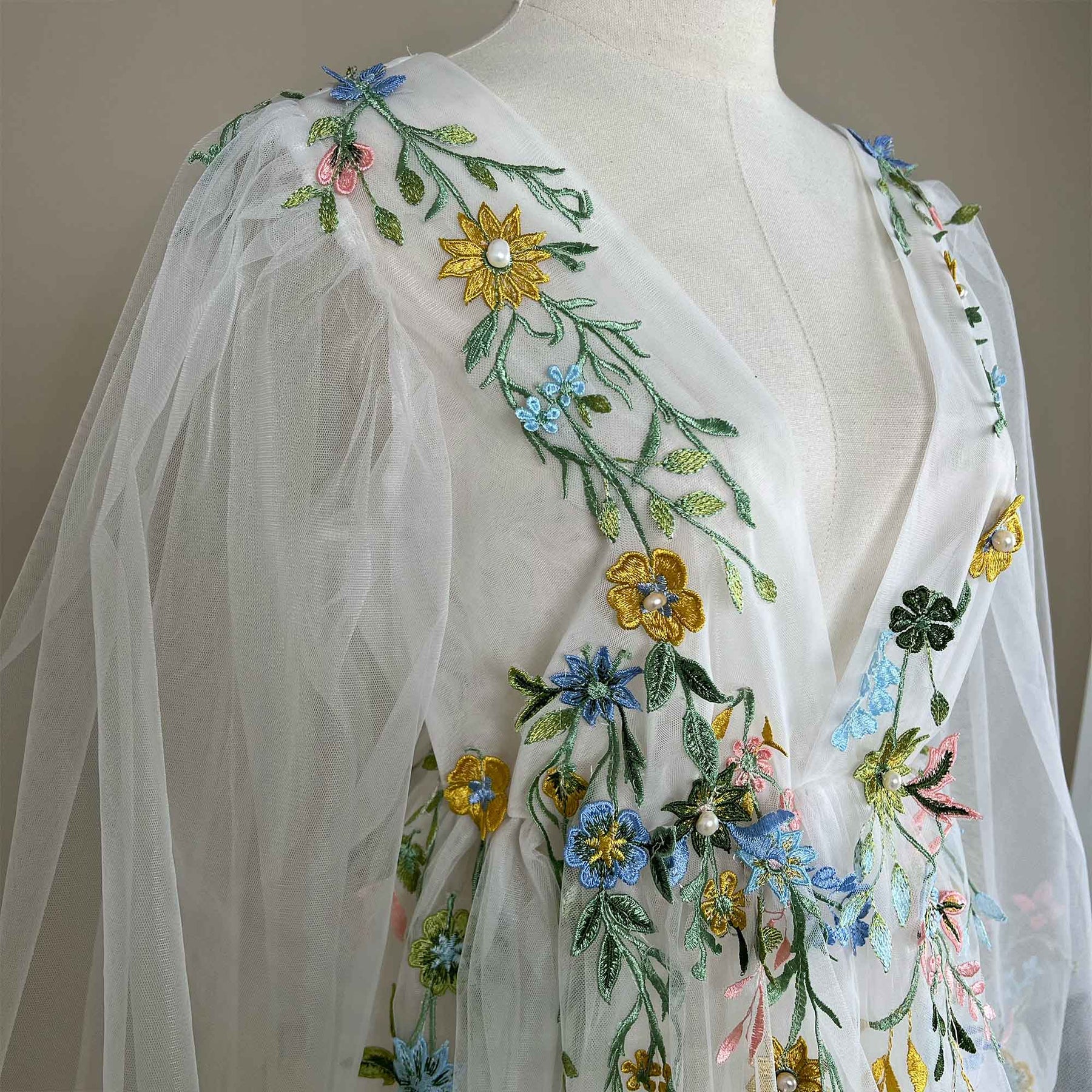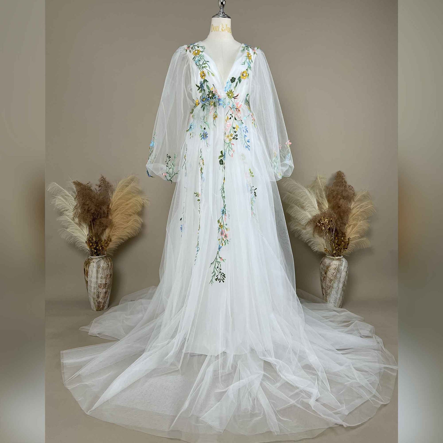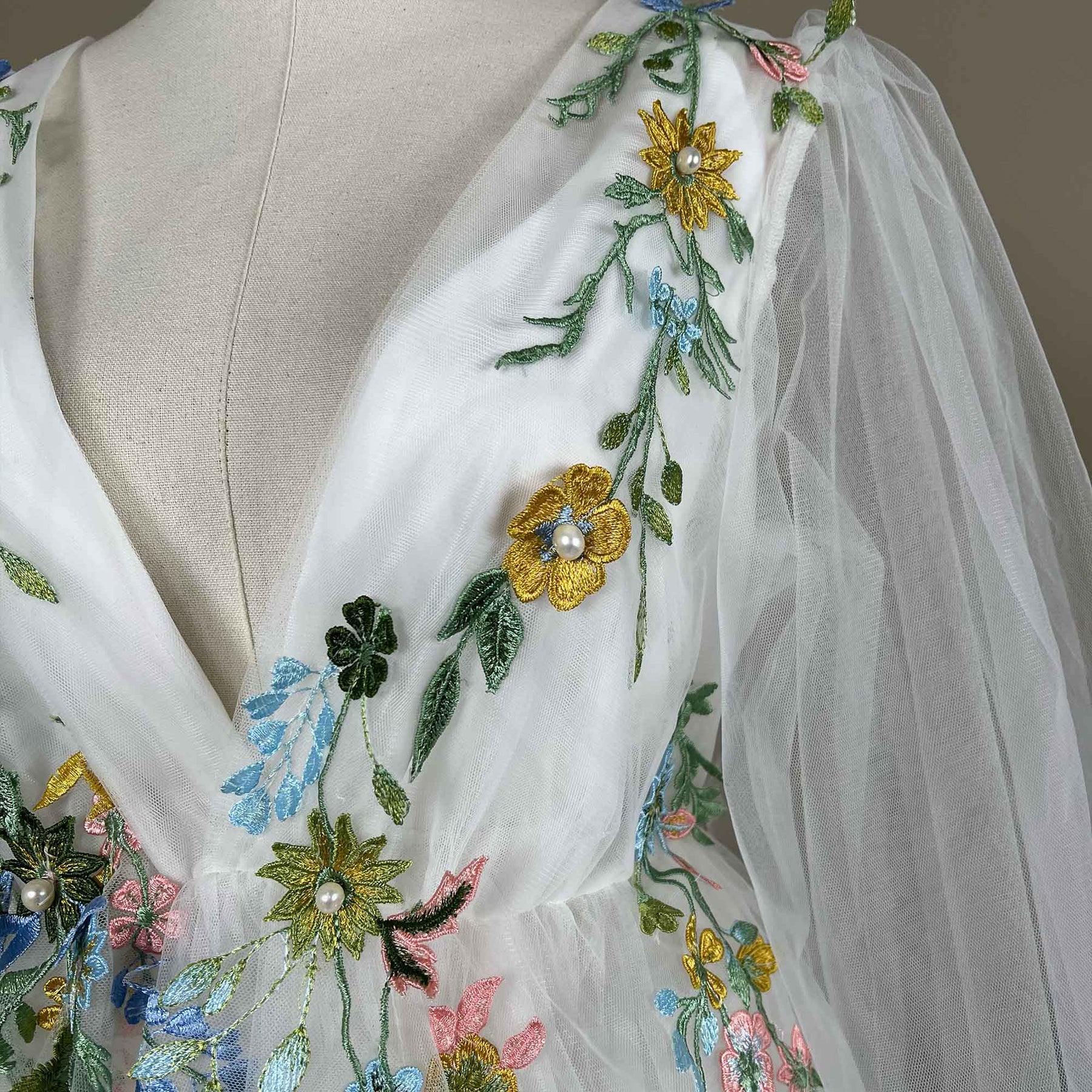 Product name: White Tulle V-Neck Puff Sleeve Dress with Green Embroidered Appliqué Gown for Photoshoot Baby Shower