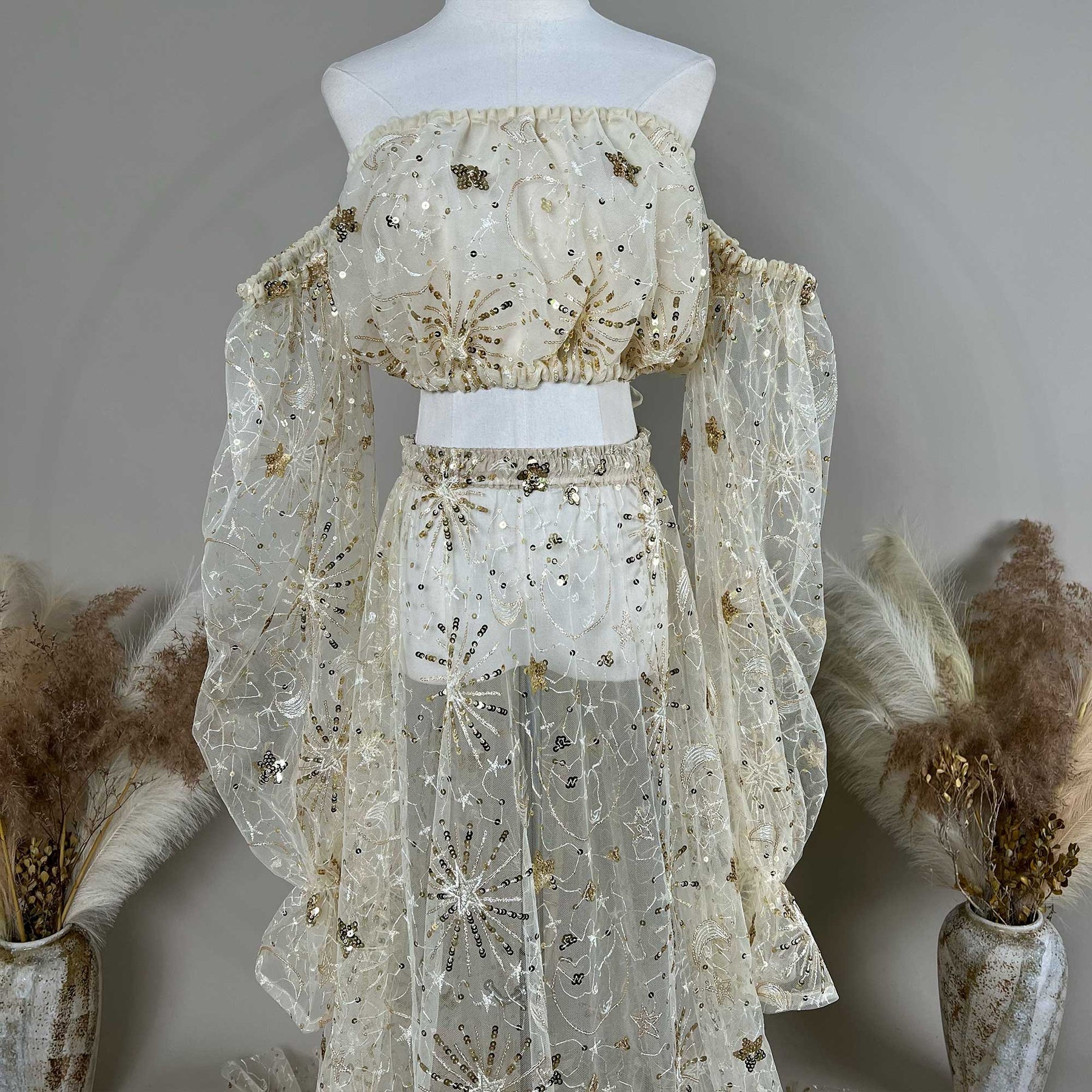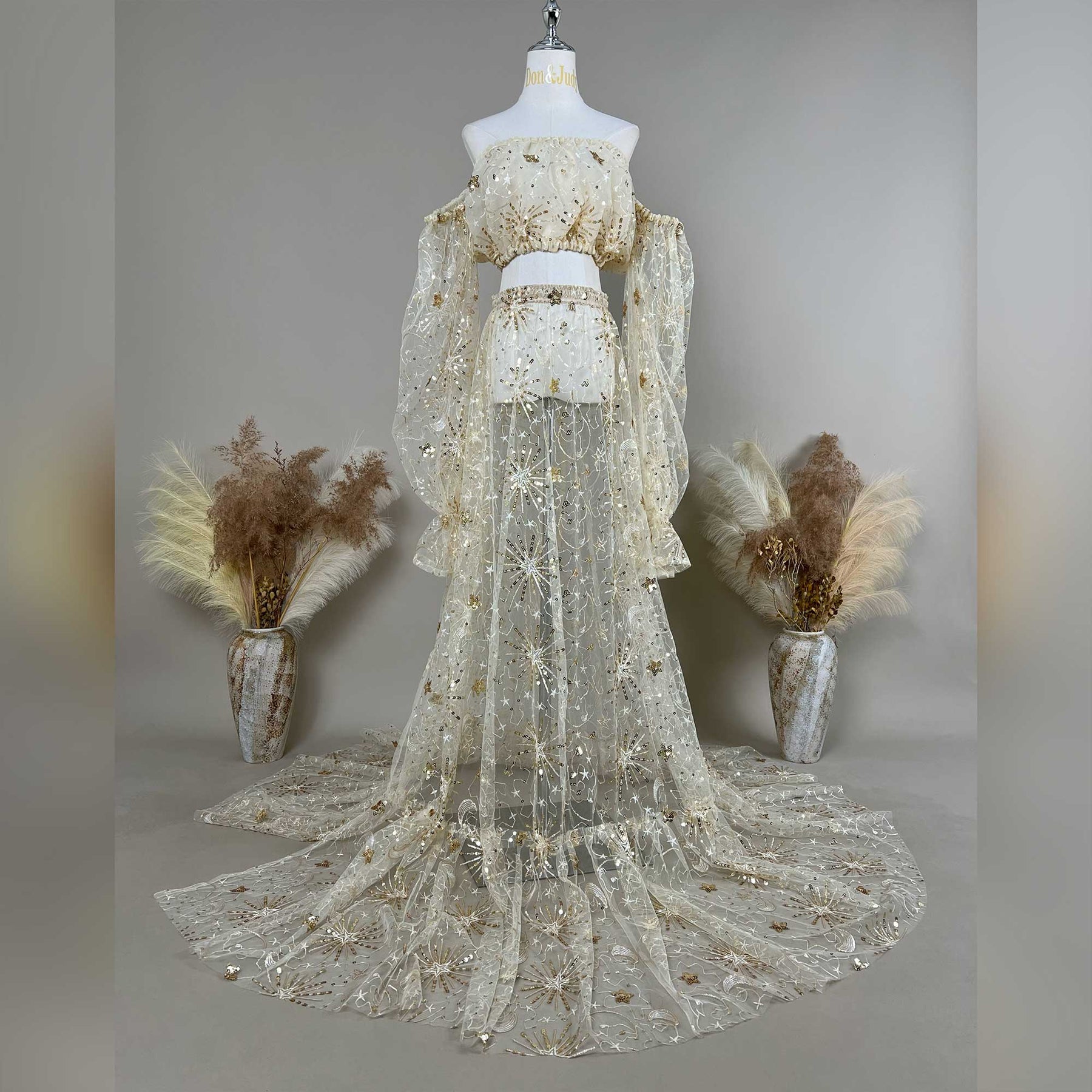 Celestial Gold Two-Piece Set Embroidered Strapless Crop Top with Detachable Sleeves & Matching Train Skirt with Metallic Starburst Thread Dress Maternity or Non-maternity Gown Pregnant Dress Photoshoot Baby Shower Gift