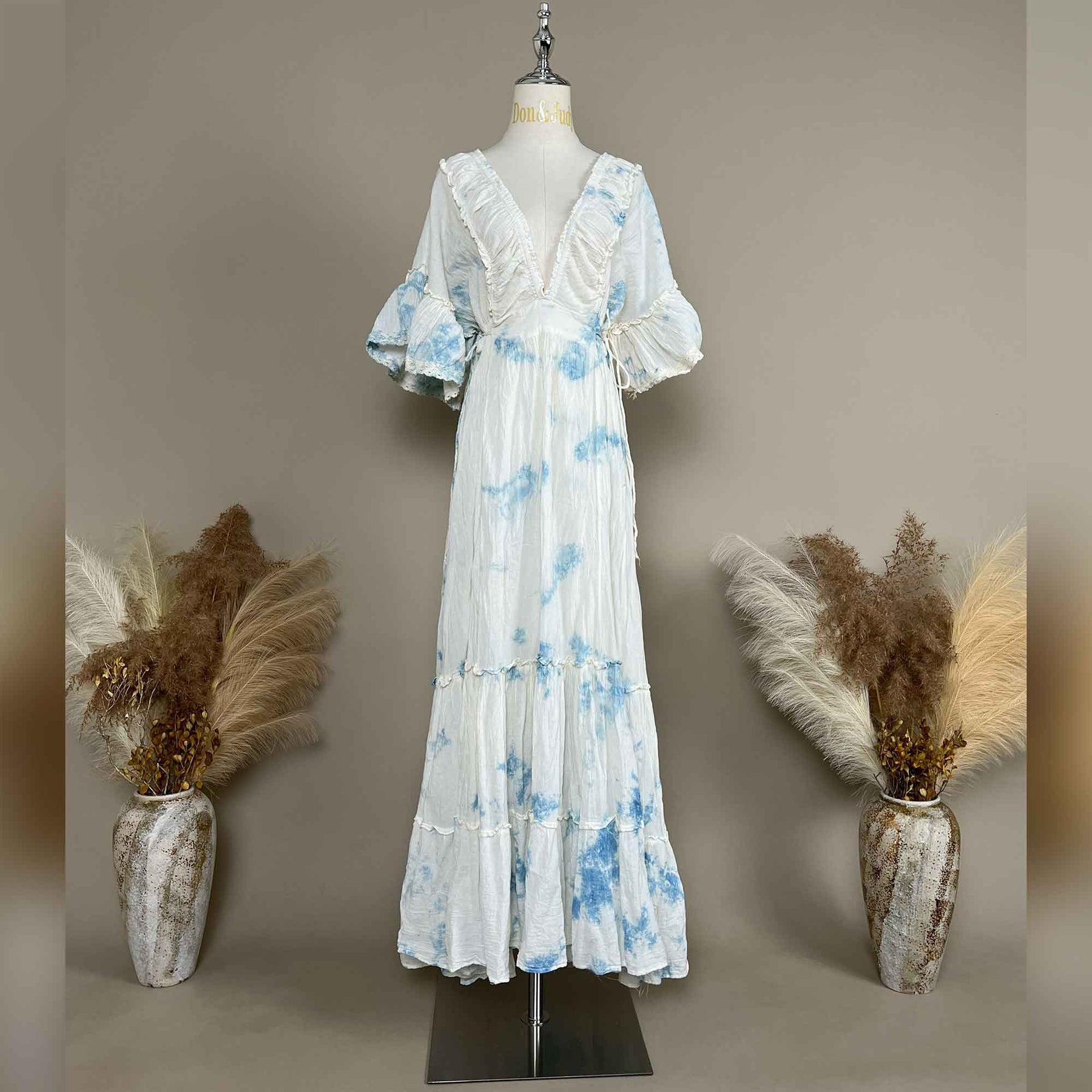 Product name: V-Neck Tie-Dye White Ruffled Bell Sleeve Dress Maternity Or Non-Maternity Gown For Photography Props Baby Shower Photos